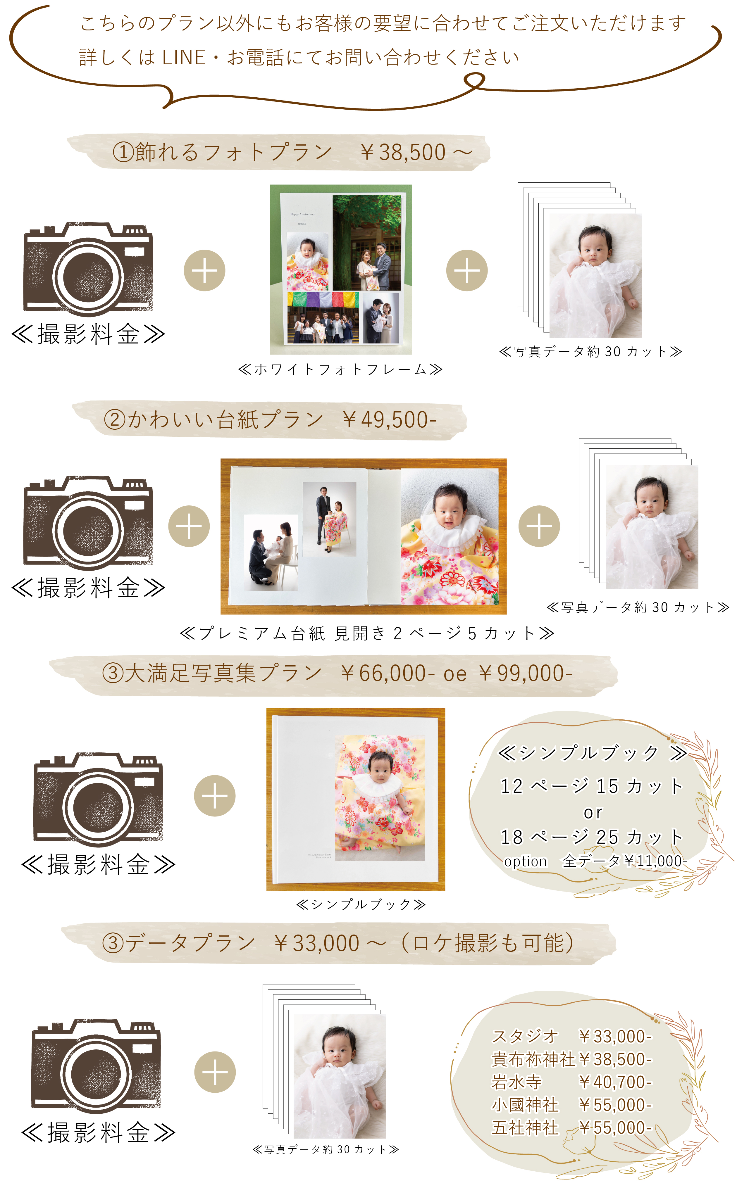 撮影後もしくは別日に 掛け着をレンタル¥3,300-して お出かけをすることが出来ます。 ※ものすごく汚れてしまった場合 クリーニング代が発生する可能性が ございます